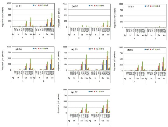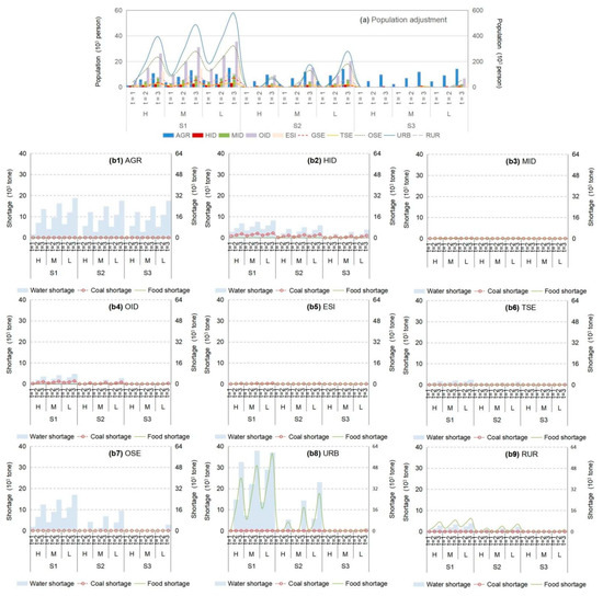 Population adjustments and corresponding water–food–coal shortages in different sectors under S1 to S3 when α = 0.99 and β = 0.6 (agricultural sector denoted as “Ag”, industrial sector denoted as “In”, service sector denoted as “Se”, municipal sector denoted as “Mu”; heavy-consumption industry plant denoted as “HID”, medium-consumption industry plant denoted as “MID”, other industry plant denoted as “OID”, energy-supply industry plant denoted as “ESI”, traditional service industry plant denoted as “TSE”, other service industry plant denoted as “OSE”, environmental protection industry plant denoted as “GSE”, urban municipal consumption plant denoted as “URB”, rural consumption plant denoted as “RUR”; high level of resource availability denoted as “H”, medium level of resource availability denoted as “M”, low level of resource availability denoted as “L”) ((a) is total population adjustment under S1, S2 and S3; (b1–b9) are water–food–coal shortages in different sectors under S1 to S3).
