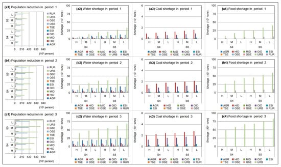 The satisfactions of water–food–energy target and corresponding population adjustments under S4 to S5 when α = 0.99 and β = 0.6 (agricultural sector denoted as “Ag”, industrial sector denoted as “In”, service sector denoted as “Se”, municipal sector denoted as “Mu”; heavy-consumption industry plant denoted as “HID”, medium-consumption industry plant denoted as “MID”, other industry plant denoted as “OID”, energy-supply industry plant denoted as “ESI”, traditional service industry plant denoted as “TSE”, other service industry plant denoted as “OSE”, environmental protection industry plant denoted as “GSE”, urban municipal consumption plant denoted as “URB”, rural consumption plant denoted as “RUR”; high level of resource availability denoted as “H”, medium level of resource availability denoted as “M”, low level of resource availability denoted as “L”) ((a1–a4) are population adjustment and corresponding WEF shortages under S4 and S5 in period 1; (b1–b4) are population adjustment and corresponding WEF shortages under S4 and S5 in period 2; (c1–c4) are population adjustment and corresponding WEF shortages under S4 and S5 in period 3).