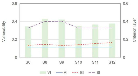 In a practical P-WEF optimization issue, the implementation of resource regulation and technique improvement can remit resource shortages and vulnerabilities, which would weaken the role of population adjustment. However, a rational design scheme for the initial population policy of the planning period can be considered an effective approach to reduce the losses/penalties of future population adjustment from the long-term perspective of urban development. Thus, various initial population policy scenarios were designed according to the historical situation of population change in Beijing (from 2000 to 2017) and the “14th Five Year Plan” of Beijing as follows: (a) the high and low population development scenarios (S8 and S9) were assumed considering 2.8% and 0.11% growth rates of the population size; (b) three scenarios (S10 to S12) associated with the adjustment of employed population scales were designed according to industrial information and reformed in the “14th Five Year Plan”, whereby 1.6%, 4.6%, and 7.1% reductions in the employed population in high-resource-consumption industries (such as agricultural and industrial sectors) were considered. Then, the vulnerability of resources (WEF) under S0 and S8 to S12 were obtained as shown in Figure 10. The results show that both a high growth mode (S8) and a low growth mode (S9) of population size would increase the WFE vulnerability in the short term taking into consideration the current population. Furthermore, it is shown that industrial transformation in Beijing can shrink the employed population scale in high-resource0consumption industries, which would reduce the corresponding WEF vulnerability.