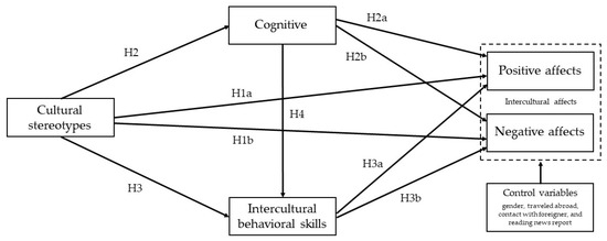 Structural equation modelling was used to determine the mediating role of cognitive knowledge and intercultural behavioral skills within the relationship between cultural stereotypes and intercultural affects. Specifically, associations between the variables including path analyses (parallel and serial) mediations were tested towards predicting the outcome variables (positive and negative affects simultaneously). Results indicate that when considering a direct approach (stereotype → positive affect and stereotype → negative affect), an increased tendency for cultural stereotypes (which are supposed to be mostly negative) leads to negative affect; alternatively, a lack of stereotypes leads to positive affect. These findings are consistent with the majority of studies that show cultural stereotypes directly impact individuals’ attitudes [95,96,97,98,99].