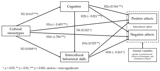 Furthermore, while no significant associations were found between cultural stereotypes and intercultural behavioral skills, behavioral skills were found to have a direct positive effect on positive affects (H3a) with β = 0.529, p < 0.01, at the same time exhibiting a significant direct negative effect on negative affect (H3b) with β = −0.263, p < 0.05. Similar to cognitive knowledge, intercultural behavioral skills, which promote cross-cultural understanding, also contribute to the improvement of positive affect. Lastly, cognitive knowledge was found to have significant direct positive effects on intercultural behavioral skills (H4) with β = 0.242, p < 0.05.