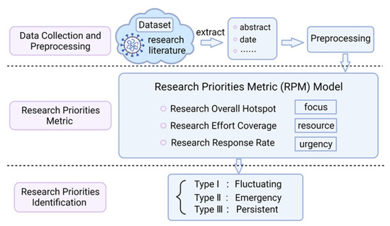 As shown in Figure 2, the Research Priorities Metric (RPM) model was proposed, which combines three metrics including Research Overall Hotspot, Research Effort Coverage, and Research Response Rate, to reveal the research priorities from three perspectives of overall focus, research resource investment and time urgency. Then, according to the evolution of the pandemic, the dynamic characteristic of RPM values during each stage of the pandemic were analyzed from both micro and macro levels.