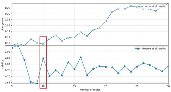 It is one of the keys to the quality of topic modeling to determine the appropriate number of topics , so as to make the same feature words between topics less while the topic distinction higher. To get the appropriate number of topics, two metrics were combined to help select the optimal potential topic structure. First, the metric proposed by Greene et al. [30] was used to assess the stability of the potential topics identified. The average weighted Jaccard distance between the ordered word sets of a topic was used to measure the stability of the topic structure. Another metric, proposed by Arun et al. [31], described the symmetric Kullback-Liebler divergence between the singular value distribution of the matrix and the row-l2 norm distribution of the matrix .