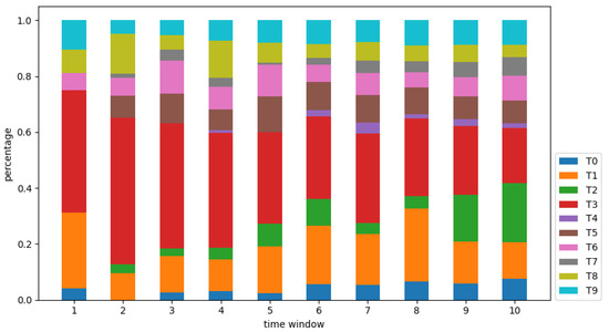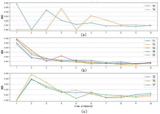 Taking 12 December 2019 as the starting point of the COVID-19 pandemic, the research time distance was calculated according to Equation (3). At the same time, the topic information entropy was calculated combined with the results of NMF. Then, the RRR was obtained according to Equation (5). By analyzing the RRR for 10 hotspots, three different trends were found. As shown in Figure 5a, T0 and T4 belong to the fluctuating type, their RRRs fluctuate greatly during the whole period, which may be related to the occurrence of specific events related to the pandemic. The occurrence of specific types of cases leads to corresponding research on clinical treatment and risk factors. In Figure 5b, T1, T3, T6, T8, and T9 belong to the emergency type, showing an overall downward trend. Such research hotspots are closely related to the pandemic, and need to be studied quickly and effectively to rescue more patients and curb the development of the epidemic. In Figure 5c, T2, T5, and T7 belong to the persistent type, the response speed is not fast as the emergency type, and the RRR reaches the peak in the second time-window, and then declines slowly for a long period. The research on more effective diagnosis and detection methods continues, and the research on nursing and health care and social psychology are particularly important in the middle and late stages of the pandemic. The RRRs of both emergency and persistent type are high in the early stage of the outbreak of the pandemic and the decline rate are fast, and stabilized at a low level in the later stage. These two kinds of research hotspots, as the main research contents of COVID-19, have been carried out throughout the entire process in a rapid and orderly manner.