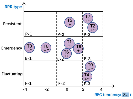 Through the research priorities metric model, the characteristics of the ROH, REC, and RRR of COVID-19 relevant scientific literature during each stage of the pandemic were obtained. ROH discovers the distribution of potential research hotspots from the abstracts of all the literature. REC measures the proportion of the research effort of each hotspot in the overall research in each time period. RRR describes the dynamic evolution characteristics of the hotspot in the time dimension. Combining REC and RRR, the research priorities of the COVID-19 pandemic was identified from static and dynamic aspects. According to the RRR of research hotspots, 10 hotspots were identified as Type I: persistent, Type II: emergency and Type III: fluctuating, and through the Mann-Kendall test, the REC trends of three types were analyzed. The identification result of the research priorities of COVID-19 pandemic relevant scientific literature is shown in Figure 6.