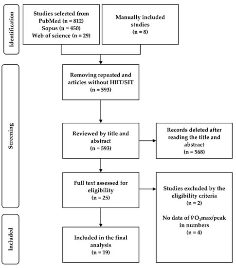 After we removed the replicated studies, those that did not include interval-training protocols and those involving animal models, 593 studies were selected for the writing of their abstract and title. After, in a second step, studies were selected based on inclusion and exclusion criteria. Studies that presented just one of the protocols and results in graphical mode that did not allow for data extraction by software were excluded [22,23,24,25]. Finally, 19 studies were meta-analyzed (Figure 1).