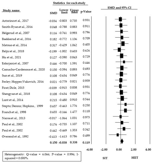 Data analysis was performed by using the Comprehensive Meta-Analysis software version 3 for Windows. The main results were presented as standardized mean difference (SMD), relativizing both the data in relative (mL·kg−1·min−1) or absolute (L·min−1) O2max/peak units according to their standard deviation. The SMD and raw mean differences (RMD) were based on the difference between the HIIT and the SIT intervention variation (post-training minus pre-training). In addition, a subgroup analysis of RMD was performed, including only studies providing relative O2max/peak data (mL·kg−1·min−1). The data were summarized by using the forest plot graph, representing the results of the SMD in the overall analysis and RMD for the subgroup analysis, and a 95% confidence interval was used for both (95% CI). Moderate correlation (r = 0.5) between pre- and post-training data and a fixed effect model were adopted for the analysis.