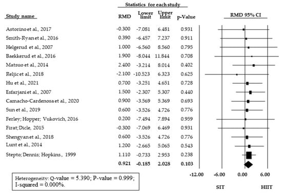 The meta-analysis showed no significant SMD between SIT and HIIT training (SMD = 0.150; 95% CI = −0.038 to 0.338; p = 0.119) (Figure 2). There was also no significant difference between HIIT and SIT for the subgroup of studies presenting relative O2max/peak data (RMD = 0.921 mL·kg−1·min−1; 95% CI = −0.185 to 2.028; p = 0.103, Figure 3).