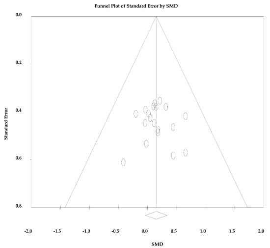 Since the analyses were significant homogeneous and considerably consistent across studies for both the outcomes measured (p = 0.999 for SMD and p = 1.000 for RMD and I2 = 0 for both), fixed effects were assumed for both analyses. There was no significant bias of publication (p = 0.828), so there was no asymmetry in the funnel plot (Figure 4).