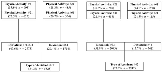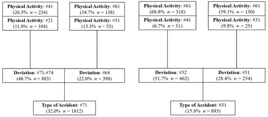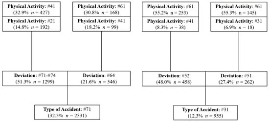 Regarding the most important characteristics of the accidents that have occurred in the three scenarios, the most common accident is the code #71, preceded in all cases by a deviation, predominantly of code #71-#74, which refers to the movement of the worker’s body as a result of physical exertion due to the handling of a load or object. This type of deviation has accounted for 47.6% in UG, 48.7% in OP and 51.3% in PP. Therefore, a preventative policy focused on reducing this type of deviation could lead to a significant reduction in accidents.