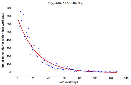 Different studies already published focused on occupational accidents in the mining industry have employed the average lost workdays as a measure to determine risk indexes of work posts and tasks, among groups of workers, and types of mines [19,20,21,22]. This measure enables one to evaluate the overall safety performance within a specific mine, since it can reflect factors, such as the effective use of first aid and rapid access to medical care, the use of personal protective equipment, and company’s policies concerning return-to-work practices [23]. In order to take account of the fatal accidents with a standard value of 6000 lost workdays, we modelled the distribution that was more closely in accordance with the number of accidents, considering the number of lost workdays both in underground coal, metal and non-metal mines, using the following density function detailed in Equation (1).