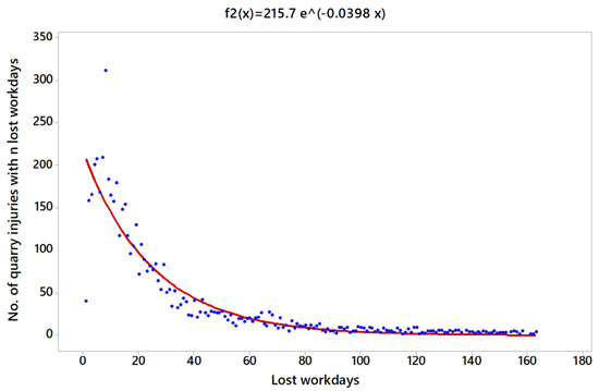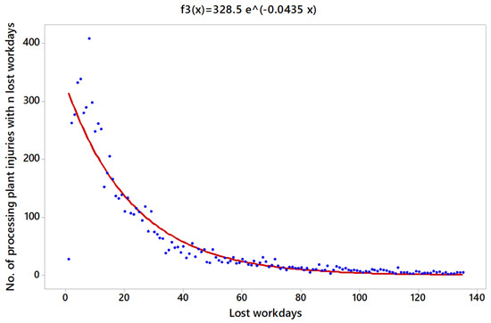 The injuries are obtained by the following linear model: , where and . Figure 4 shows the fitted exponential function denoted by . Where 1 is the minimum and 128 is the maximum number of lost workdays registered in the data base, =. Dividing by this value, it is possible to obtain a new function , which can be used as a probability density function. A was obtained, which can be considered as a good coefficient of determination for predictions.