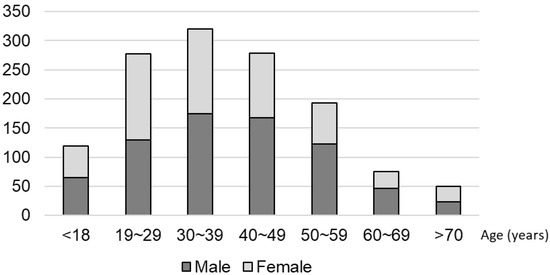 In total, 1184 patients (660 men and 521 women) participated from 11 dental practices. The majority of these participants were in the 20–50 years age groups (Figure 2).