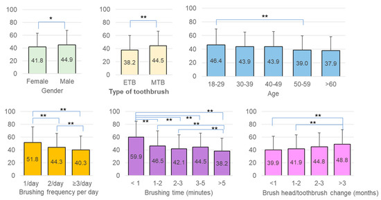 Women had a significantly lower PIS compared to men (p = 0.0142). Similar PISs were recorded in all age groups; however, a significantly higher PIS was observed in participants in their twenties (46.4% ± 23.1%) compared to those in their fifties (39.0% ± 20.5) (p < 0.01). In addition, the PIS became significantly lower as the frequency of tooth brushing increased per day (once vs. twice p < 0.01; once vs. three times p < 0.05). Brushing for at least 2 min was important for plaque control as these participants had significantly lower PISs than those brushing less than 2 min (p < 0.01). The highest PIS observed was in participants who brushed for less than 1 min, and the lowest was seen in those who reported brushing for more than 5 min. The frequency of replacing brush heads/toothbrushes also influenced plaque removal efficacy. Using the same toothbrush for more than three months was associated with a significantly higher plaque score (p = 0.0005). Furthermore, we found that ETB users had substantially better plaque control than MTB users (p = 0.0004) (Table 1).