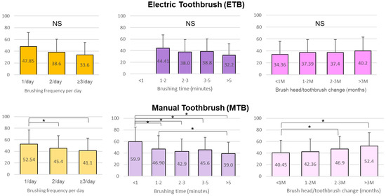 We found that MTB users tended to replace brush heads more frequently than ETB users. This could be explained by the fact that an MTB is more likely to splay after being used for three months compared to an ETB [34]. In this study, we also observed that the frequency of replacement significantly affected the MTB users’ PIS. This could also be attributed to the fact that manual brushes tend to wear faster, and toothbrush wear was significantly associated with higher plaque scores [35]. It is essential to regularly replace a brush head, whether electric or manual, with significant wear as plaque removal efficiency will be reduced [35].