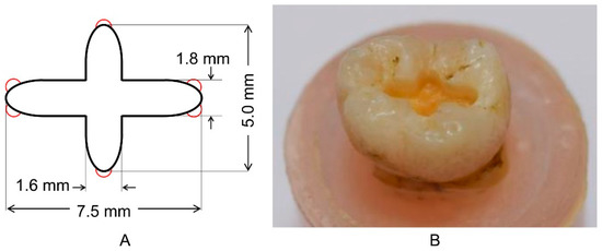 For filling dental amalgams, 80 caries- and restoration-free extracted molars were obtained according to protocols approved by the research ethics committee at the Nippon Dental University (NDU-T2013-17). To standardize the tooth position in parallel, the plane was composed of three cusps: the mesial buccal and lingual, and distal buccal. In the base plane of the mold, the teeth were placed in acrylic-cylindrical molds (15 mm of inner diameter) using self-curing resin (Ostron II, GC, Tokyo, Japan), and the height of the tooth, the distance between the occlusal plane and the base plane of the mold, was set to 25 mm. A 2-mm depth of cross-shaped cavity (Figure 1) was prepared in the center of the tooth using a cavity duplication machine (prototype device, Tokyo Giken, Tokyo, Japan) [33,34,35,36] with a diamond point (123, Horico Dental, Berlin, Germany). Then, dentin undercuts were prepared using an inverted cone bur (653-002, Tokyo Dental Industrial, Tokyo, Japan). A capsule of dental amalgam (Logic Plus, Shofu, Kyoto, Japan) was placed in an amalgam mixer (Spherical-D, Shofu, Kyoto, Japan) and mixed according to the manufacturer’s instructions. The cavity prepared at the center of the tooth was filled with dental amalgam, and the teeth with dental amalgam were stored in deionized water at 37 °C for seven days.