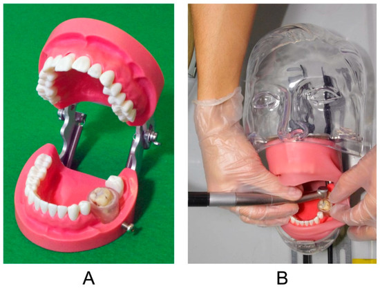 The prepared tooth was set to the left first molar position of a phantom head (Simple Manikin III, Nisshin, Tokyo, Japan) with a rubber cover (SPM III, Nisshin, Tokyo, Japan) mimicking the buccal mucosa (Figure 2). An air turbine (twin-power turbine, Morita, Osaka, Japan) with a carbide bur (FG 699, Shofu, Kyoto, Japan) was used to remove dental amalgams. The rubber cover and carbide burr were changed to new items for every dental amalgam removal.