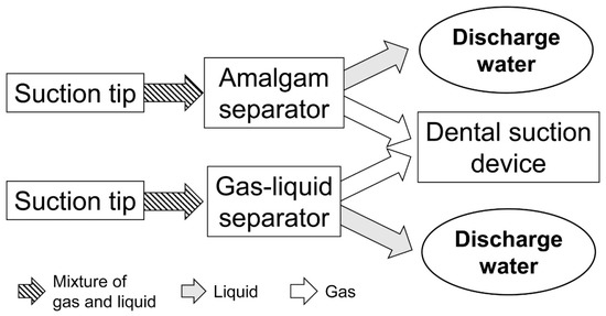 After removing the dental amalgam, the oral cavity of the phantom head was washed using 100 mL of deionized water to mimic the patient’s mouse rinse, and the water was collected as samples of “oral rinse water”. Furthermore, to clean the inside of the drainage system, 500 mL of deionized water was suctioned and collected as samples of “system rinse water”. A schematic of the drainage system is shown in Figure 3. For both the oral rinse water and system rinse water, samples were collected by two methods: drained water captured through an amalgam separator (CAS 1, Dürr Dental, Bietigheim-Bissingen, Germany) as method “AM”, and through a gas–liquid separator (7 L separator, Tokyo Giken, Tokyo, Japan, capacity: 7.0 L) as method “GL”. A suction dental device (TCV-CS1000, Tokyo Giken, Tokyo, Japan; suction power: 17.65 kPa) was connected in both methods. For measuring the mercury amount, a highly-sensitive mercury analyzer (WA-5A, Nippon Instruments, Tokyo, Japan), which used vapor deposition of mercury with gold foil and atomic absorption spectrometry, was used. Measurements were performed on the same day of sample collection.