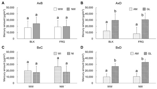 Regarding the results of the system rinse water, a significant difference (p < 0.05) was found in the interaction A × C, and highly significant differences (p < 0.01) in all factors (A, B, C, and D), as well as the interactions A × B, A × D, and B × C. According to the results of Tukey’s multiple comparisons, significantly smaller mercury was found in FRG (9598 μg/m3), WW (9658 μg/m3), NI (9796 μg/m3), and GL (8467 μg/m3) than BLK (12,093 μg/m3), NW (12,034 μg/m3), WI (11,896 μg/m3), and AM (13,224 μg/m3), respectively (p < 0.05). Figure 5 shows the graphs of the two-factor interactions, which showed significant differences according to four-way ANOVA. In the interaction of A × B (Figure 5A), WW showed a significantly higher mercury amount than MW in BLK (p < 0.01), but there was no significant difference between WW and NW in FRG (p > 0.05). NW in BLK showed a significantly higher amount of mercury than both WW and NW in FRG (p < 0.01) (Table 3). In the interaction of A × C (Figure 5B), WI in BLK showed a significantly higher mercury amount than NI in FRG (p < 0.01), but there were no significant differences among other combinations (p > 0.05). In the interaction of A × D (Figure 5C), AM in BLK was significantly higher than in other conditions (p < 0.01), but there were no significant differences among other combinations (p > 0.05). The interaction of A × B (Figure 5D) was significantly smaller for WW in GL than for other conditions (p < 0.01).