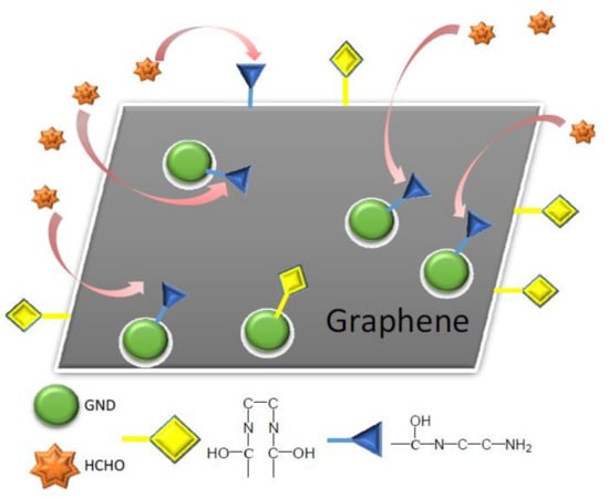 Graphene nanomaterials had also been used for the carbonyl VOCs removal. Various graphene materials (such as amino functionalized graphene sponge—G/S or amino functionalized graphene sponge decorated with graphene nanodots—G-GND/S) were employed to remove the indoor formaldehyde [73]. The second material was characterized by high concentration of amine groups on the surface comparing with the first one, resulting in its high interaction with the formaldehyde (Figure 2).