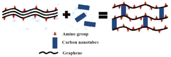 Other studies reported the use of amino-functionalized graphene aerogel as a composite with carbon nanotubes in order to remove gaseous formaldehyde [74]. The adsorption of formaldehyde was both chemical and physical. The chemical adsorption process was due to the van der Waals forces between the amino groups of graphene and the carbonyl group from formaldehyde. In the case of the composite material, carbon nanotubes induced the reduction of pore diameters, resulting the exposure of more amino groups for the VOC uptake (Figure 3), reaching a maximum adsorption capacity of about 27 mg/g.