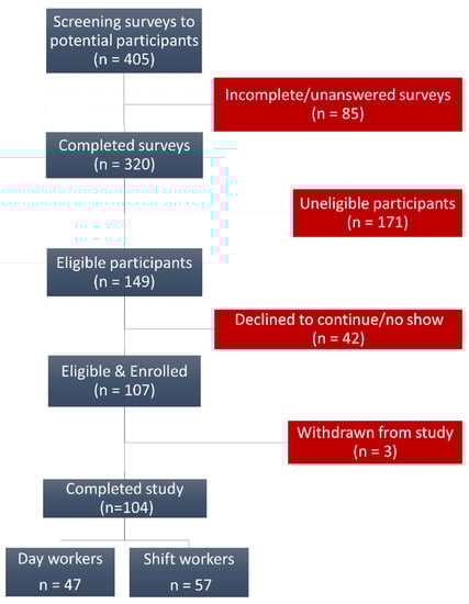 Our recruitment process (Figure 1) allowed us to complete analyses for 104 participants (47-day workers and 57 shift workers). Self-reported racial-ethnic frequencies show a diverse population in which minorities are well represented. Overall, we recruited similar proportions of African Americans (45%) and Whites (42%). Asians (7%), Hispanics (3%), and participants of mixed ethnic background (3%) were also represented. Overall, a large percentage of participants were healthcare workers (84%) and females (89%). We found that shift workers were significantly younger (mean ± SE = 28.26 ± 0.62 years) than day workers (35.32 ± 1.24 years), and we found no statistically significant difference in BMI between the groups.