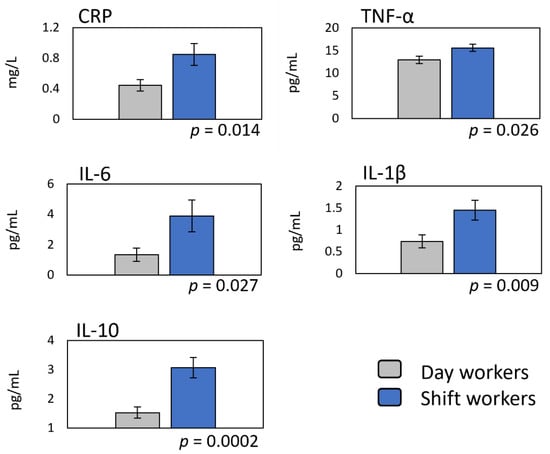 Changes in distinct markers of systemic inflammation as a function of shift-work exposure. Data (n = 104; 57 shift workers) represent group means ± standard error. Differences were assessed by the student’s t-test for independent samples. Respective p values indicate statistical significance.