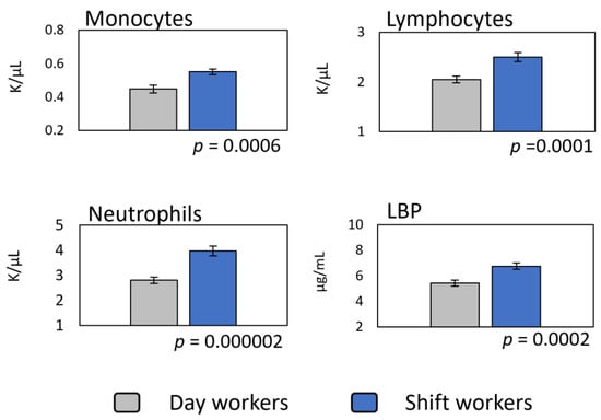 Because monocytes, lymphocytes, and neutrophils all respond to LPS and because these cells are significant contributors to the observed systemic cytokine increase in shift workers, we assessed changes in systemic endotoxemia as a function of shift-work exposure. We assessed LBP (a proxy for lipopolysaccharide) in the plasma samples (Figure 3). When compared to the day workers, the shift workers had a mean concentration of LBP that was 26% higher (6.82 ± 0.27 vs. 5.42 ± 0.24 μg/mL).