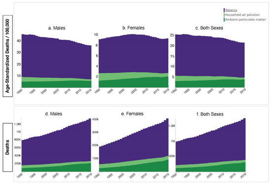 Global Tracheal, Bronchus, and Lung Cancer Mortality (Age-Standardized Deaths/100,000, Absolute Deaths) Attributed to Tobacco, Household Air Pollution, and Ambient Particulate Matter Pollution Exposures, by Sex, from 1990–2019.