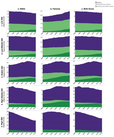 Global Tracheal, Bronchus, and Lung Cancer Mortality (Age-Standardized Deaths/100,000) Attributed to Tobacco, Household Air Pollution, and Ambient Particulate Matter Pollution by Sociodemographic Development Index (SDI) and Sex, from 1990–2019.
