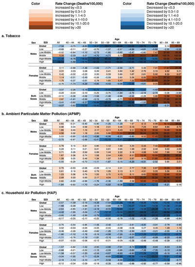 Changes in Tracheal, Bronchus, and Lung Cancer Mortality (Age-Standardized Deaths/100,000) Attributed to Tobacco, Ambient Particulate Matter Pollution, and Household Air Pollution Exposures, by Sex, Age Group, and Sociodemographic Development Index (SDI), from 1990–2019. Cell values represent the calculated difference between the 2019 and 1990 death rate for a given subgroup (2019 deaths/100,000–1990 deaths/100,000). Generated in Microsoft Excel.