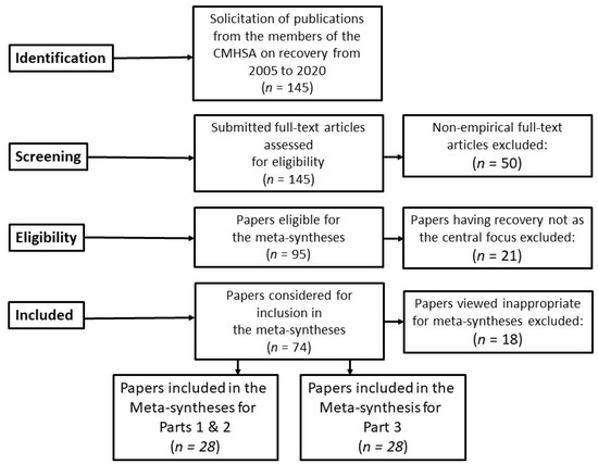 Figure 1 shows the steps taken by the research team for the meta-syntheses for Parts 1, 2, and 3, using a PRISMA flow diagram. The details of the steps followed in assembling the database for this study are somewhat simplified because the publications included in these meta-syntheses were those of the members of the CMHSA research team.