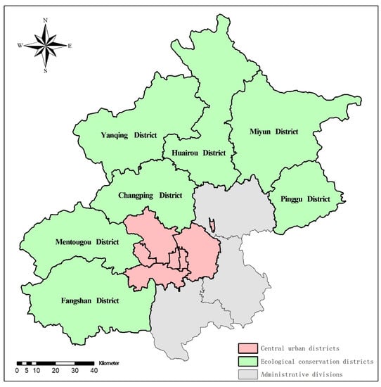 In 2017, Beijing issued The Beijing Urban Master Plan (2016–2030) and proposed to build a sustainable “green Beijing” in the new era. According to this plan, the districts of Beijing have a new functional orientation, including central urban districts and ecological conservation districts, as shown in Figure 2. Seven districts (Mentougou District, Pinggu District, Huairou District, Miyun District, Yanqing District, Changping District and Fangshan District) were selected as ecological conservation districts with stricter regulations on environmental protection and more support on ecological development. Compared with the central urban districts where medical resources are abundant and medical institutions are clustered, these districts suffer from a significant relative lack of medical resources due to their remote location. To provide accurate assessment and efficient improvement of primary healthcare resources, this study focuses on these 7 ecological conservation districts.