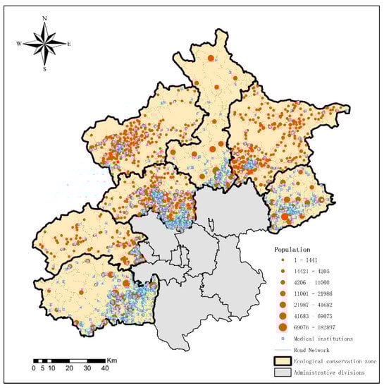 Data on primary health care institutions in 2016 were obtained from the Beijing Municipal Commission of Health and Family Planning, including the names, addresses, and the number of health professionals of the hospitals. The health professional includes chartered doctors, assistant chartered doctors, certified nurses, pharmacists, laboratory technicians and other professional medical workers, excluding hospital administrators. The road network and administrative boundary data in 2016 came from China’s National Basic Geographic Information System. Population data at the community level were obtained from the public security system in most districts except for Pinggu and Huairou Districts which were at the street level. Figure 3 shows the distribution of primary health care institutions and population in the seven ecological conservation districts.