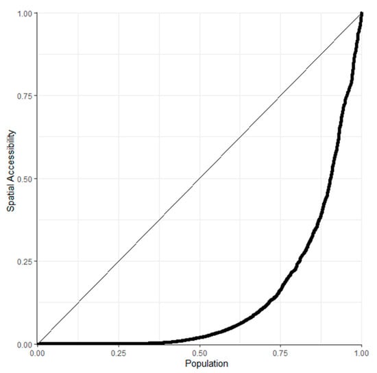 Figure 4 depicts the Lorenz curves for primary health care services by population. According to the figure, more than 75% of people shared only approximately 25% of the spatial accessibility, while the remaining less than 25% had three times as many resources as the former, indicating that the spatial distribution of medical resources in the area we studied is uneven. The Gini coefficient of primary medical services in seven ecological conservation districts was calculated to be as high as 0.705. The standards exceed the value of 0.4 mentioned above, which means a high level of unfairness. Therefore, it is necessary to redistribute medical resources in these areas based on a fairness model that enables the government to provide more equitable access to primary health care services.