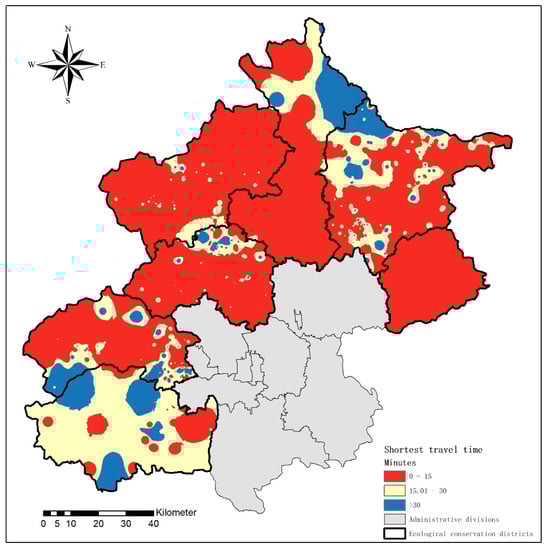 Table 1 presents a classification of the shortest travel time to primary health care facilities in the seven ecological conservation districts, including the percentage of communities and population. Similar results were obtained by calculating both communities and populations. Overall, 81.22% of communities reached the nearest primary care institution within 15 min, 11.55% did it in 15–30 min, and only 7.23% accomplished it in more than 30 min. Of the 124 communities that took more than 30 min, 58 were from Mentougou District, 40 were from Huairou District, and 15 were from Changping District. A total of 82.88% of the population arrived at the nearest primary health care institution within 15 min, 11.39% of the population reached it in 15–30 min, and 5.74% of the population reached it in more than 30 min. Of the population that arrived in more than 30 min, 37.4% were from Fangshan District, 33.0% were from Miyun District, and 18.2% were from Mentougou District.