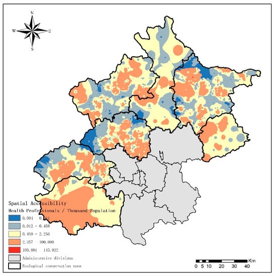 To indicate the accessibility of these areas quantitatively, we use common medical evaluation indicators. In 2016, the standard of the number of health professionals per 1000 people in Beijing was 12.19, and the average level of spatial accessibility of primary health care was 2.34 based on the ratio of the number of health professionals per 1000 people in primary health care institutions.