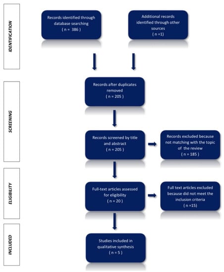 The articles resulting from the search phase in the databases listed above produced a total of 386 articles. Another noteworthy article was also identified during the review that was not detected from the research but that many other analyzed articles cited. After this first search, 182 duplicates were eliminated, thus identifying 205 unique articles. The small number of studies confirms that this is a new field and that its potential has still to be fully explored.