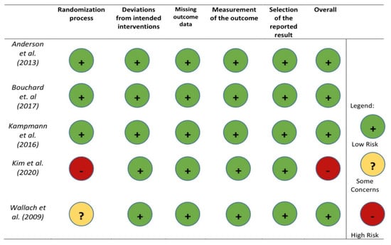 - Sterne, J.A.C.; Savović, J.; Page, M.J.; Elbers, R.G.; Blencowe, N.S.; Boutron, I.; Cates, C.J.; Cheng, H.Y.; Corbett, M.S.; Eldridge, S.M.; et al. RoB 2: A revised tool for assessing risk of bias in randomised trials. BMJ 2019, 366, l4898. [Google Scholar] [CrossRef] [PubMed] [Green Version]