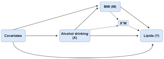 The relationship among alcohol consumption (X), BMI (M), and lipids (Y).