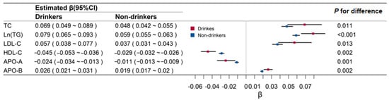 Table 1 summarizes descriptive characteristics of study variables by drinking status. Continuous variables were compared between drinkers and non-drinkers, adjusting for age (except age itself). The mean levels of alcohol consumption, TC, TG, APO-A, APO-B, and energy intake were significantly higher in drinkers, while non-drinkers had higher LDL-C. In total, 77.7% of non-drinkers have never drunk, while over a half of drinkers drink every day. In addition, the proportion of males was higher among drinkers than among non-drinkers; the distribution of educational level had significant group differences.