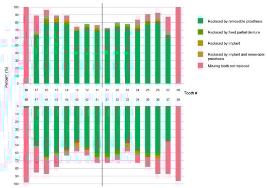 Regarding the localization, missing teeth in the maxilla were most frequently replaced by complete dentures (58.2%), followed by partial dentures (20.0%; cast partial dentures = 10.9%, combined dentures (telescope, interlock, attachment, etc.) = 9.1%). In the mandible, only 38.2% had complete dentures, equally followed by partial dentures (23.6%; cast partial dentures = 14.5%, combined dentures = 9.1%). In the mandible, 29.1% had no removable prosthesis. Figure 1 shows an overview of all replaced teeth and their means of replacement.