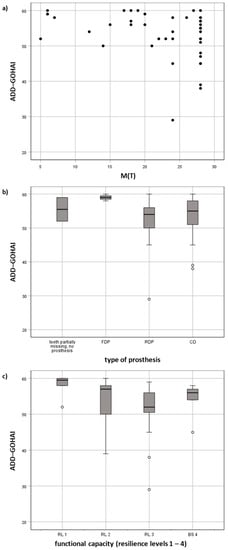 Influencing factors of OHRQoL in centenarians: (a) association of missing teeth M(T) with the ADD-GOHAI (scatter plot), (b) association of the type of dental prosthesis and (c) dental functional capacity with the ADD-GOHAI (box plots).