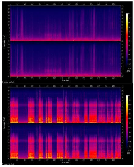 Spectrograms of the silent room (upper figure—peak level dB was −13.40) and the noisy room (bottom figure—peak level dB was −0.56).