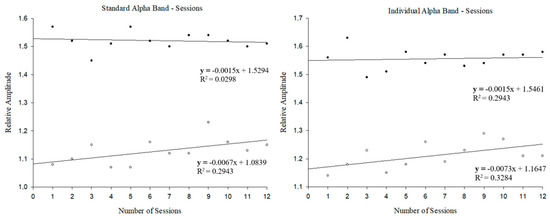 Differences between session 1 and 12 standard alpha band (left image) and individual standard alpha band (right image) for each protocol; filled dots represents the silent room group and empty dots represents the noisy room group.