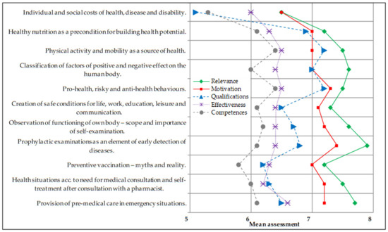The surveyed pharmacy students’ assessments of qualifications, competences, relevance, motivation and effectiveness differed between the items in the subdomains. In the subdomain “health knowledge” (Figure 1), the lowest assessment was given to individual and social costs of health, diseases and disabilities, while the highest—to prophylactic examinations as an element of early detection of diseases.