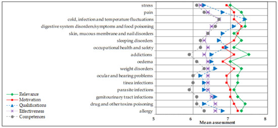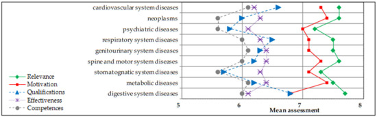 In the subdomain “disease prevention” (Figure 2), the lowest assessments were given to psychiatric and stomatognatic system disease prevention, while the highest to digestive system diseases prevention.