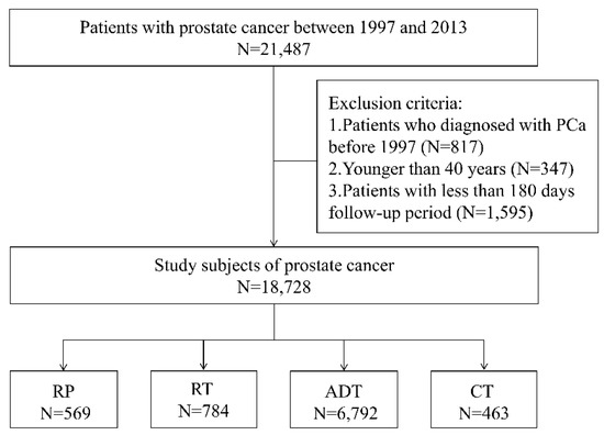 All patients with PCa older than 40 years in the RCIPD database were enrolled in this study. The study period was between 1997 and 2013, and all patients who received a new diagnosis of PCa during the study period were included. The accuracy of the PCa diagnosis was high for all patients, and enrollment in the RCIPD was certified by NHI experts. The exclusion criteria for this study were patients diagnosed with PCa before 1997, patients younger than 40 years, and patients with less than 180 days’ follow-up. The study subjects were further divided into four groups according to PCa treatment. Those who only received RP were defined as the RP group; those who only received RT were defined as the RT group; those who currently received ADT were defined as the ADT group; and those who currently received CT were defined as the CT group listed in Figure 1.