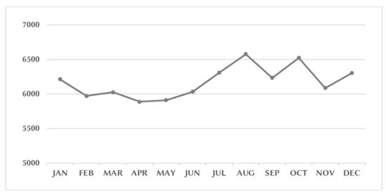 The distributions of diagnostic categories associated with ED visits among patients with PCa are listed in Table 3. With the exception of ill-defined symptoms or signs, the most common reasons that patients with PCa visited the ED were injury/poisoning (16.79%), genitourinary disorders (10.66%), and digestive disorders (10.48%). The monthly ED visits of PCa patients are shown in Figure 2. Increased numbers of ED visits were noted in August and October. The distribution of monthly ED visits according to the different PCa treatment groups is displayed in Figure S2. We observed increased numbers of ED visits in August among the RP, RT, and CT groups. An increase in October was observed for the ADT group.