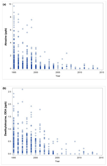 Data used in this study provided evidence of seasonal variation of atrazine, D.E.A., and D.I.A. While May and June are the peak season for atrazine application [39,40], December, January, February, and March, which are winter/early spring seasons, were observed in this study as the months with groundwater peak atrazine, D.E.A., and D.I.A. In contrast, another study reported peak atrazine concentration in late summer and early autumn. This was attributed to rainfall [41]. Nebraska’s intense rainstorms in May and June may contribute to atrazine leaching after application. This, therefore, suggests that peak groundwater atrazine detected in the winter and early spring may result from a time lag of five to seven months required for atrazine transition from the application site to groundwater.